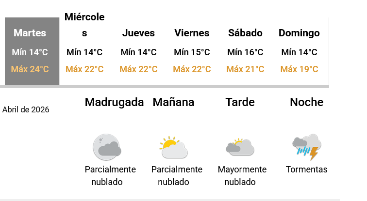 Los datos del Servicio Meteorológico Nacional (SMN) que se adjuntan pronostican la presencia de un día martes con temperaturas casi primaverales en este avanzado otoño, al igual que se viene dando desde jornadas atrás, y con un lunes que tuvo de máxima temperatura a las 16 con casi 26 grados, similar a lo que se observó este último fin de semana.