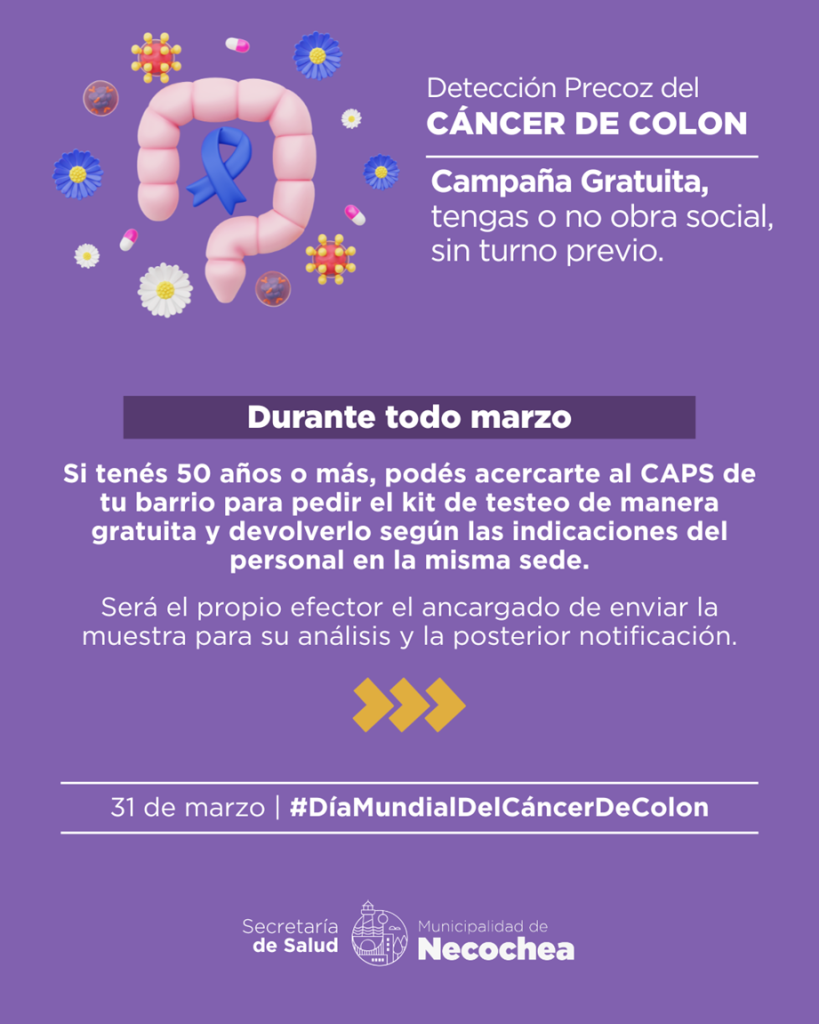 En el marco del Día Mundial del Cáncer de Colon, que se conmemora cada 31 de marzo, la Secretaría de Salud de la Municipalidad de Necochea puso en marcha una campaña gratuita de prevención y detección precoz destinada a la comunidad.