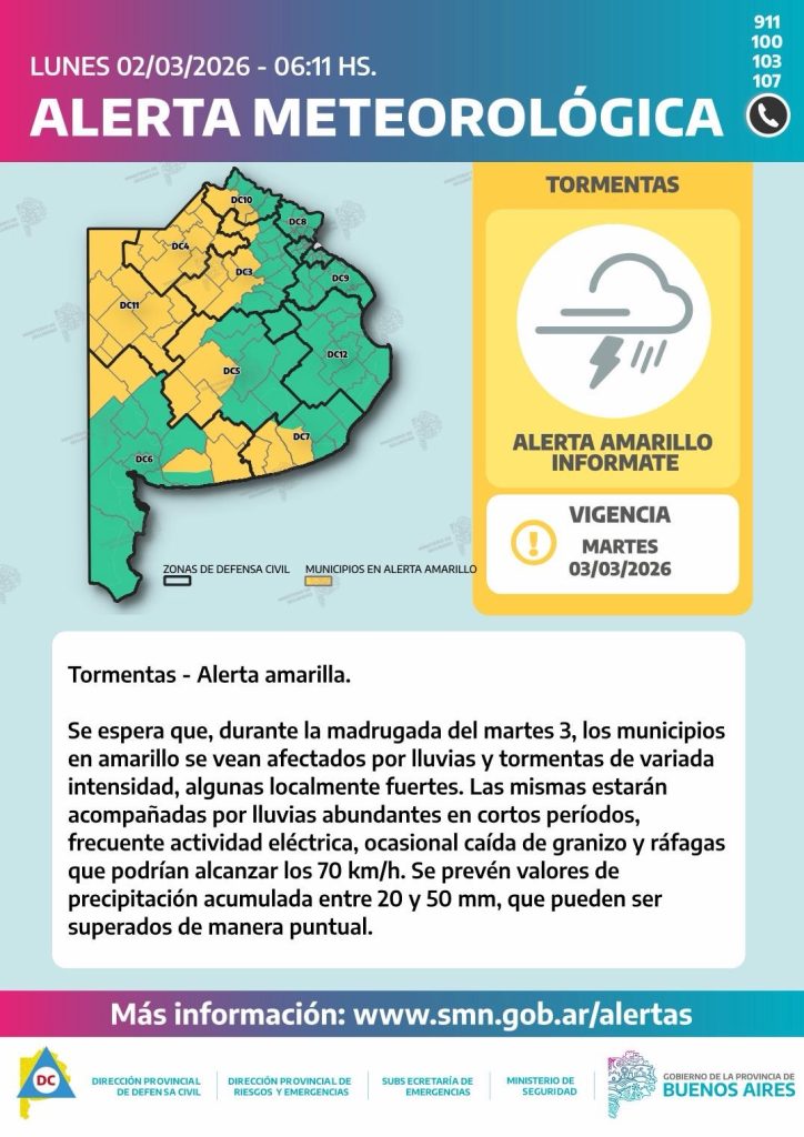 Estas condiciones de inestabilidad se extenderán a partir de la tarde a sectores del, centro y oeste de la provincia de forma progresiva, donde también se pueden registrar tormentas localmente fuertes.
