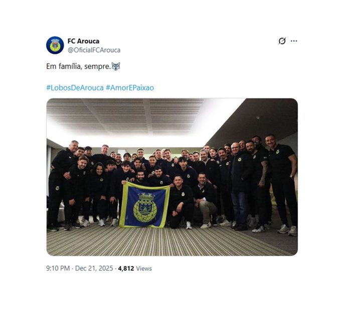 La cuenta oficial del FC Arouca se sumó a la ola de reconocimientos y difundió una fotografía del plantel junto al seguidor, ambos sosteniendo una bandera del club. El mensaje elegido fue: “En familia, siempre”. Las reacciones no tardaron en replicarse en redes sociales.
