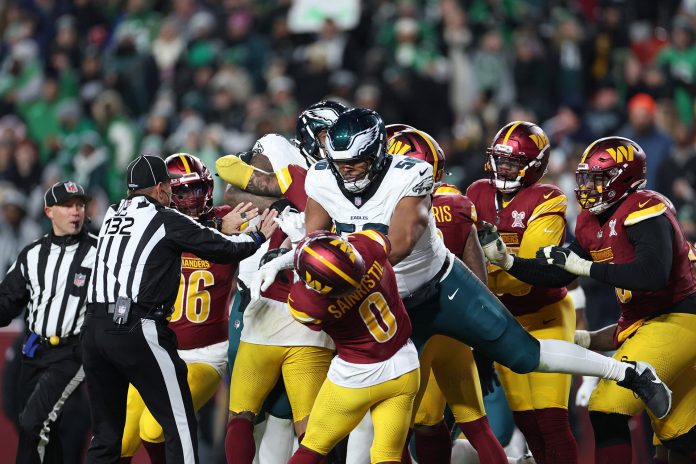 El partido entre los Philadelphia Eagles y los Washington Commanders desbordó la tensión en el último cuarto del partido disputado el sábado por la noche, cuando tres jugadores fueron expulsados tras una pelea, justo después de la conversión de dos puntos que otorgó una ventaja clave a los locales. La batalla campal se produjo cerca del final del encuentro, que terminó 29-18 a favor de los Eagles, lo que aseguró el segundo título consecutivo de la Conferencia Nacional división Este (NFC).
