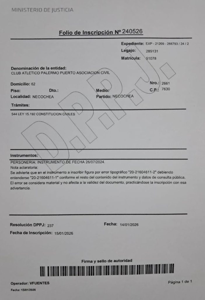 El Club Palermo Puerto ya tiene su personería jurídica