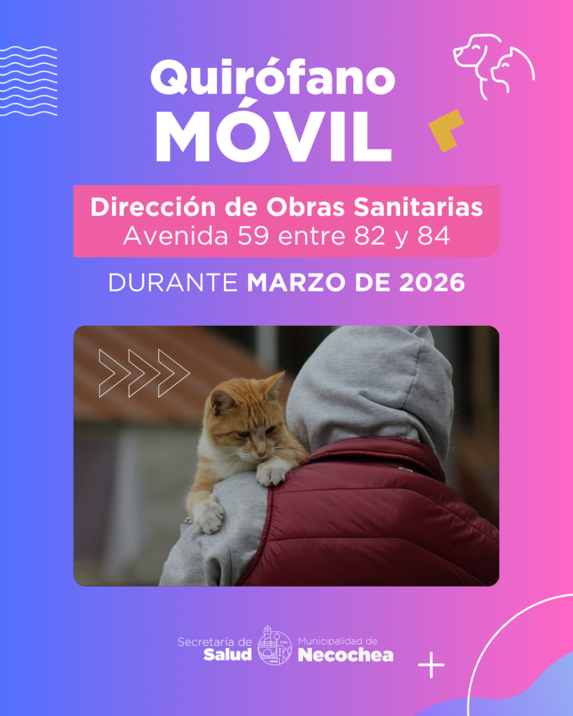 La Municipalidad de Necochea, a través de la Dirección de Bromatología e Higiene, informa que, dando continuidad a una de las políticas de salud pública más solicitadas por los vecinos, el Quirófano Móvil iniciará sus actividades de marzo en una nueva ubicación: las puertas de la Dirección de Obras Sanitarias, en Avenida 59 entre 82 y 84.