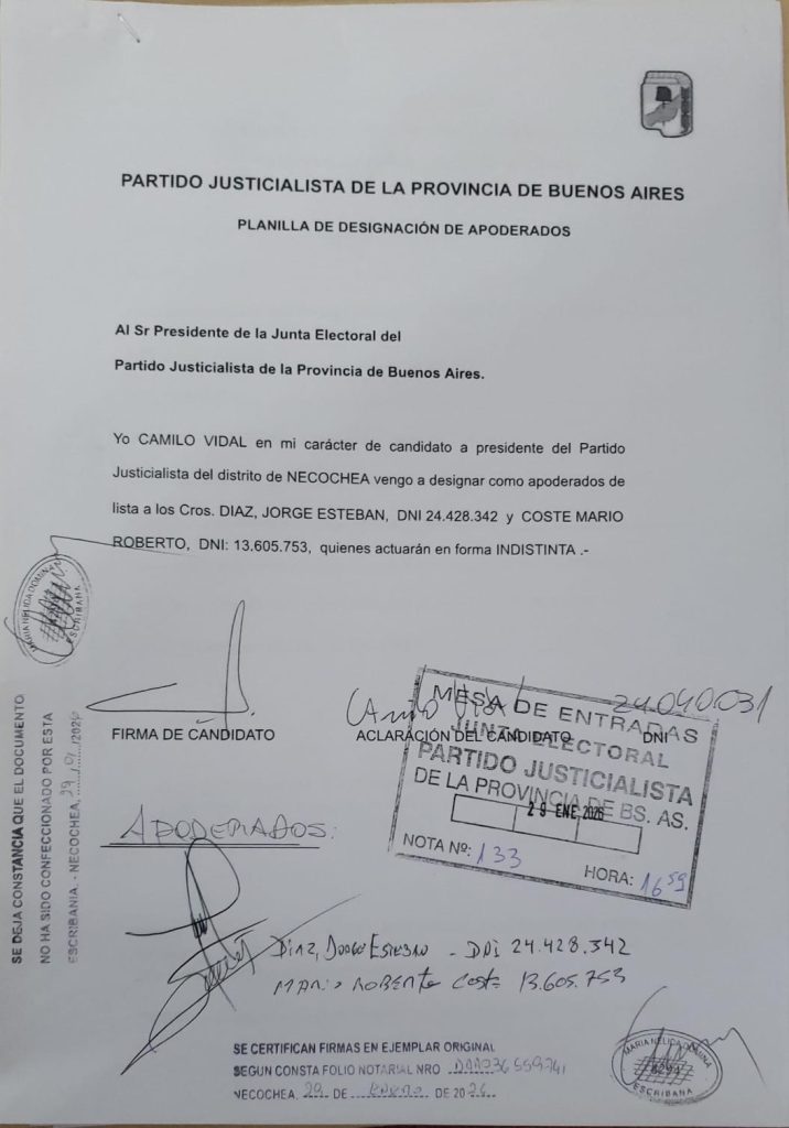 Con la rúbrica del candidato a presidir el peronismo local, Camilo Vidal, en los preparativos previos a la definición de las autoridades partidarias, de cara a la elección del PJ anunciada para el 15 de marzo, se conocieron los nombres de quiénes serán los apoderados del espacio conocido como Movimiento Derecho al Futuro (MDF) en Necochea, o sea la representación política del gobernador Axel Kicillof.