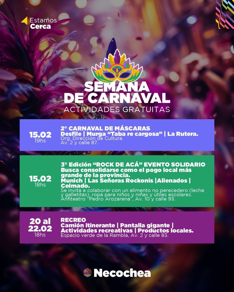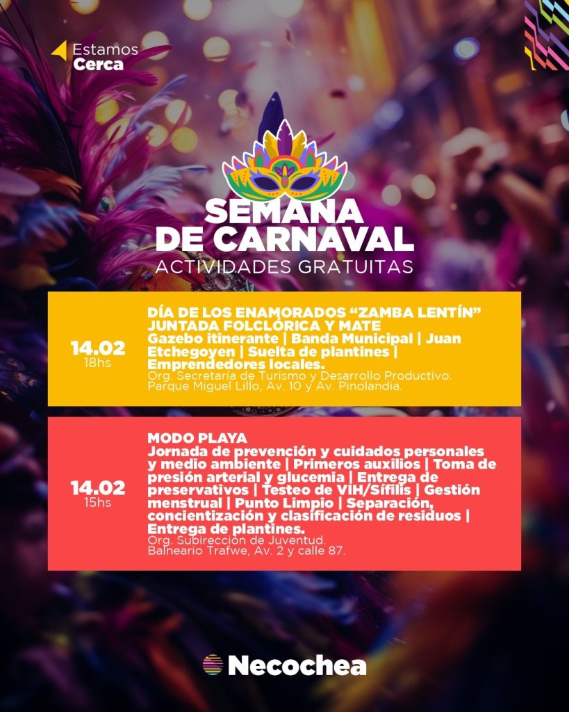 La Secretaría de Turismo y Desarrollo Productivo de la Municipalidad de Necochea, a cargo de Matías Sierra, dio a conocer la agenda de actividades programadas para la Semana de Carnaval, que comienza el venidero sábado, con el feriado extralargo del lunes 16 y martes 17.