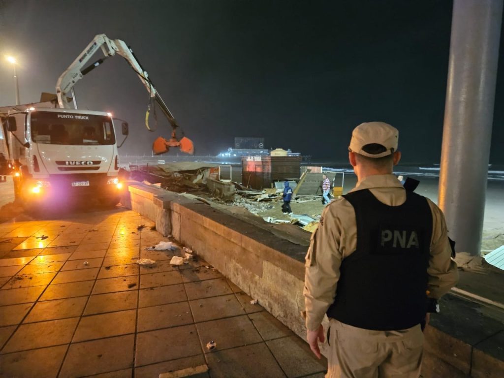 Tras estas acciones, y a solicitud de la Secretaría de Seguridad del Municipio de General Pueyrredon, Prefectura colaboró en horas de la madrugada de este miércoles con personal y medios para brindar seguridad perimetral en el predio de la Unidad Turística Fiscal “Paseo de Compras Bristol”, donde empleados de la comuna procedieron al desarme de la totalidad de los puestos feriantes que se encontraban instalados en el lugar.