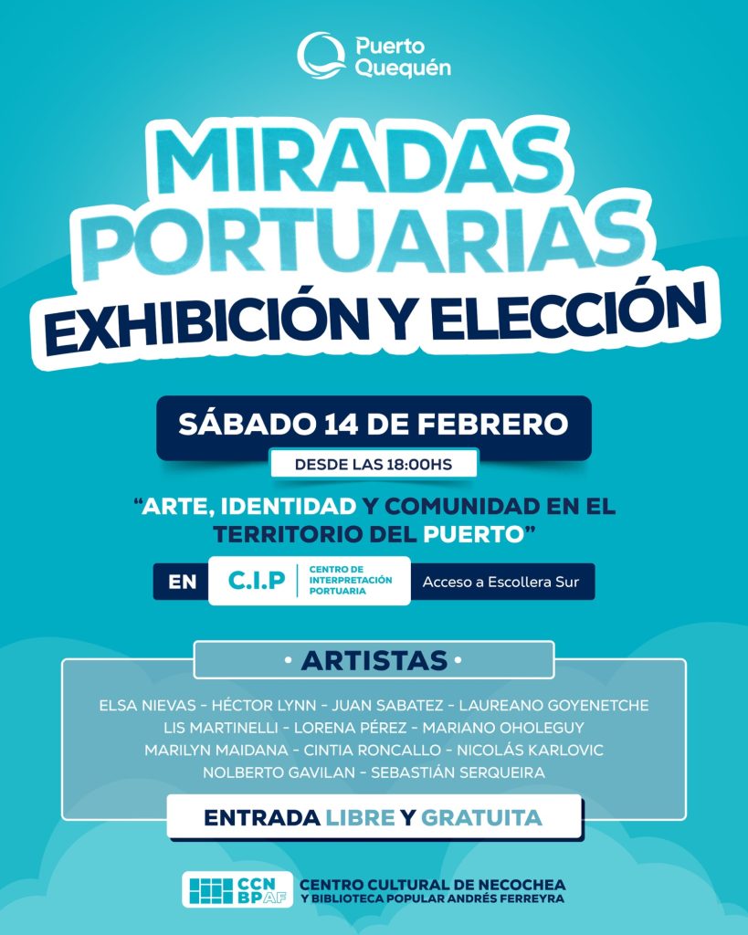 En el marco de la programación cultural que se desarrolla en el Centro de Interpretación Portuaria (CIP), ubicado en el acceso de la Escollera Sur, Puerto Quequén y el Centro Cultural Necochea – Biblioteca Popular Andrés Ferreyra invitan a la muestra que se presentará el próximo sábado 14 de febrero a partir de las 18 h. La misma contará con la presencia del grupo de artistas que participó de la jornada de Miradas Portuarias desarrollada el pasado sábado 7 de febrero en inmediaciones de la escollera sur. La presentación culminará con la elección de los tres cuadros más votados por el público durante la semana comprendido por el sábado 14 y 21 de febrero.