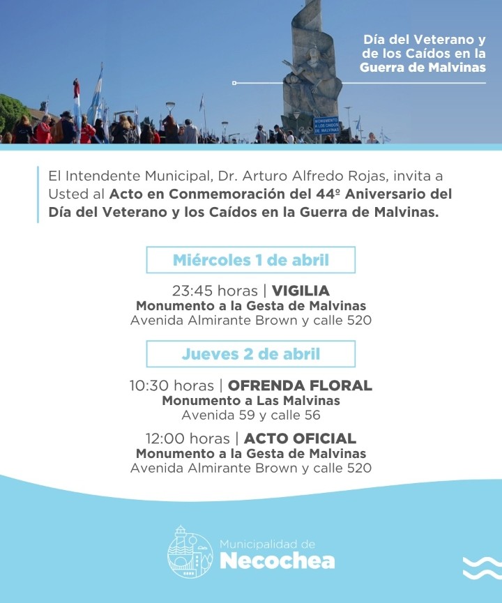 La Municipalidad de Necochea invita a la comunidad a participar de los actos oficiales al cumplirse el 44º aniversario de la Gesta de Malvinas, este jueves 2 de abril.