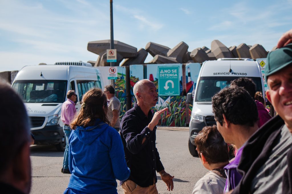 El itinerario incluyó, en primer lugar, la observación y explicación del mural de la Escollera Sur, donde se abordaron aspectos vinculados al arte, la identidad local y el entorno marítimo. Posteriormente, el grupo realizó la visita al sector de lobos marinos, donde los participantes pudieron conocer más acerca de esta especie característica de la región, su hábitat y su importancia dentro del ecosistema marino.