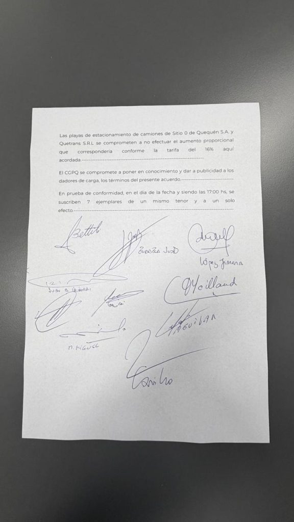 También se acordó “que las playas de estacionamiento de camiones de Sitio 0 y Quetrans no aplicarán el aumento proporcional correspondiente al 16% acordado en la tarifa”