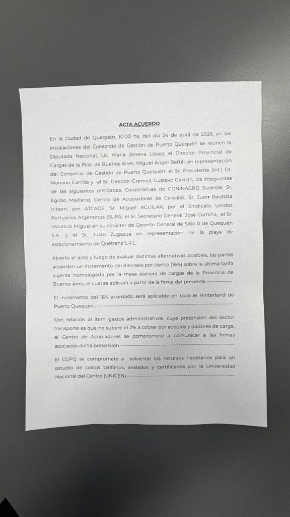 Luego de evaluar distintas alternativas, las partes acordaron un incremento del 16% sobre la última tarifa vigente homologada por la Mesa Asesora de Cargas de la Provincia de Buenos Aires. Dicho aumento comenzará a aplicarse desde la firma del acuerdo y tendrá alcance en todo el hinterland de Puerto Quequén.